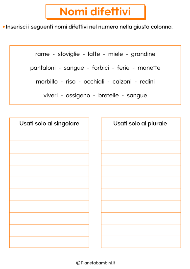 I nomi difettivi sono nomi, abbastanza comuni e molto utilizzati, che hanno una particolarità che può sfuggire. Si tratta di parole che non hanno la resa al singolare, oppure non hanno la resa al plurale.